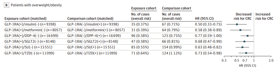 在整個人群中,GLP-1受體激動劑對結直腸癌的影響。此外,與其他5種非GLP-1受體激動劑抗糖尿病藥物相比,GLP-1受體激動劑治療也與較低的結直腸癌風險相關。最后,研究團隊還在肥胖/超重患者分析了不同藥物對結直腸癌發病率的影響。研究發現,在肥胖/超重患者中,與胰島素相比,GLP-1受體激動劑治療患結直腸癌的風險降低50%;與二甲雙胍相比,GLP-1受體激動劑治療患結直腸癌的風險降低42%。