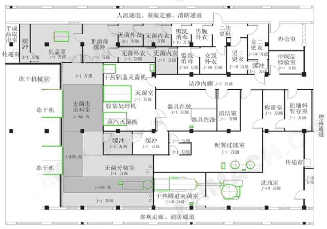 (3)工藝平面圖中的潔凈區布置,是否按照無菌制造工藝對無菌操作區和普通潔凈區進行了恰當分區或隔離處理。各個生產用功能房間的布置應該按照無菌室優先布置的原則進行。即在平面設計中,各個生產功能房間圍繞著有利于提高制造工程的無菌保證度、符合工藝流程與方便使用的設計原則進行分區布置。
